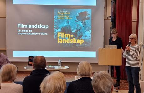 Det var fullsatt i bibliotekets hörsal i lördags när Caroline Alesmark, journalist och författare från Österlen, berättade om sin bok ”Filmlandskap". Förutom själva filmerna fick publiken veta lite om vad som hänt bakom kulisserna och annan kuriosa, till exempel att "Kalle på Spången” med Edvard Persson trots censur kunde visas i Köpenhamn under kriget eftersom tyskarna inte uppfattade att den handlar om den lille mannen mot makten.